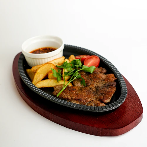 Это аппетитная свинина, обжаренная в виде сочных стейков, подается с золотистыми картофельными дольками, создавая сытное и по-домашнему вкусное блюдо.