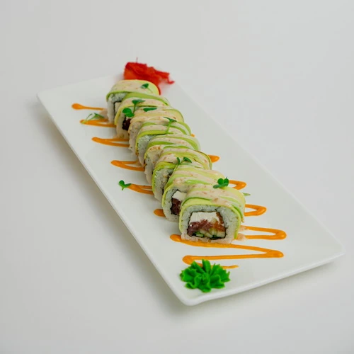 это вкусное сочетание свежего тунца и форели, кремового авокадо, обернутое в рис и нори