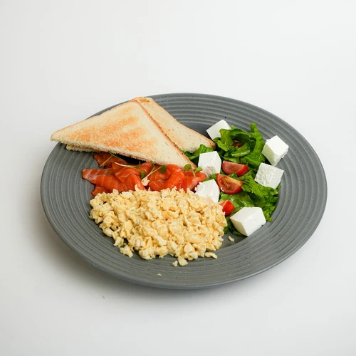 это аппетитный завтрак, состоящий из тостового хлеба, омлета из куриного яйца , нарезанной слабосолёной форели, сыра фета, помидоров черри и свежего листа салата.